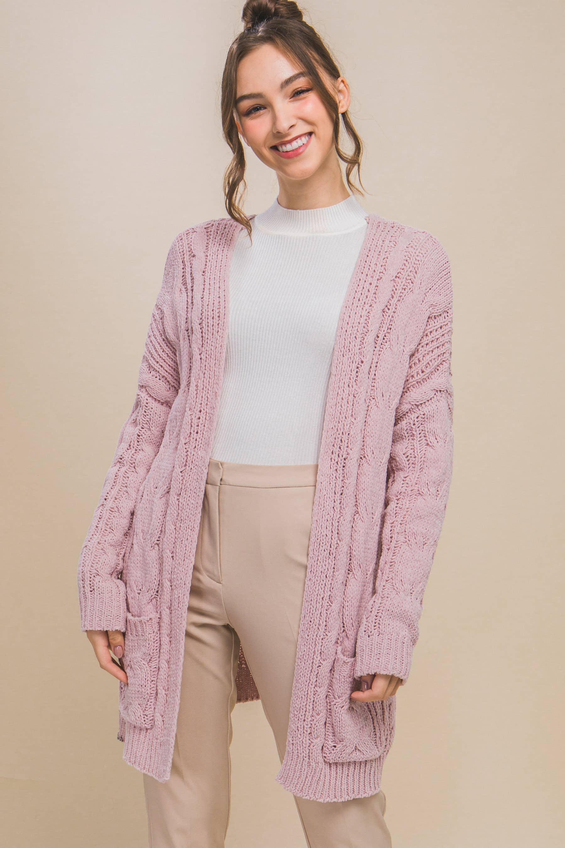 Upgrade your winter wardrobe with the Paula Chunky Knit Cardigan. This cable knit sweater cardigan in the a light pink color will add cozy texture and classic appeal to any outfit. The open front design, ribbed trim, and side pockets make this versatile cardigan a must-have for cold weather.