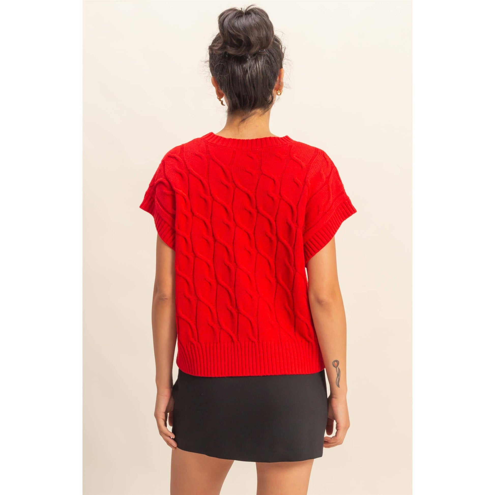 You'll be feeling cozy and looking sweet wearing this sweater vest. Accented with an eye-catching cable knit detailing, this oversized sweater comes with a crew neck and ribbed edges to create an effortlessly stylish look. Designed In The USA