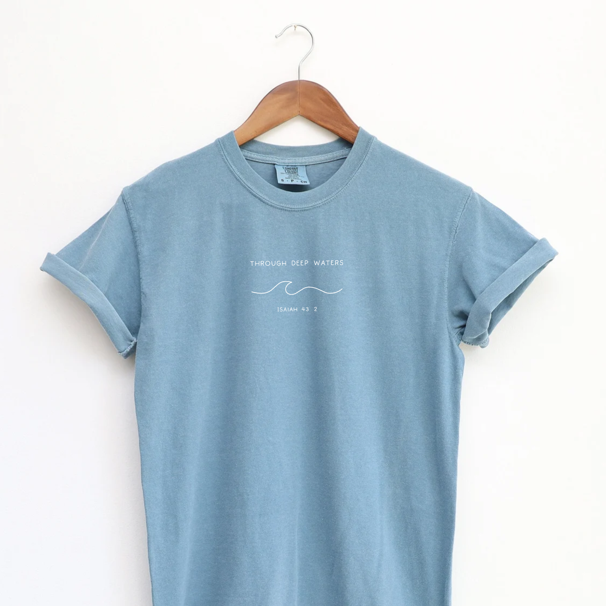 Elevate your wardrobe with our Through Deep Waters Graphic Tee. Crafted from irresistibly soft USA cotton, this tee offers a comfy, unisex fit. Show off your faith in Jesus and choose your desired fit by sizing up or down. Perfect for everyday wear, this tee is preshrunk and garment-dyed for ultimate comfort.